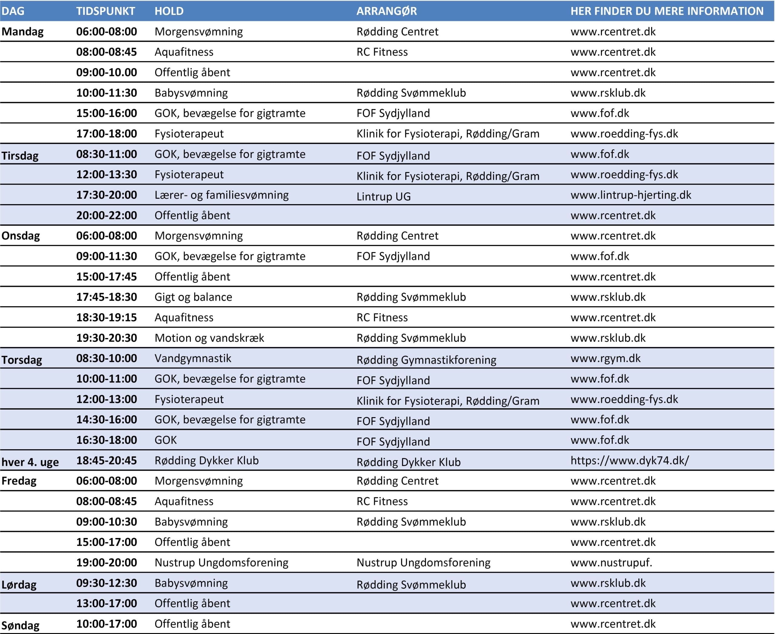 Her finder du en oversigt over ugens aktiviteter i varmtvandsbassinet i Rødding Centret. Det giver dig et hurtigt overblik over, hvornår der er planlagte aktiviteter, og hvem der står for dem. Uanset om du søger træning, afslapning eller sjov for hele familien, er der noget for enhver smag.